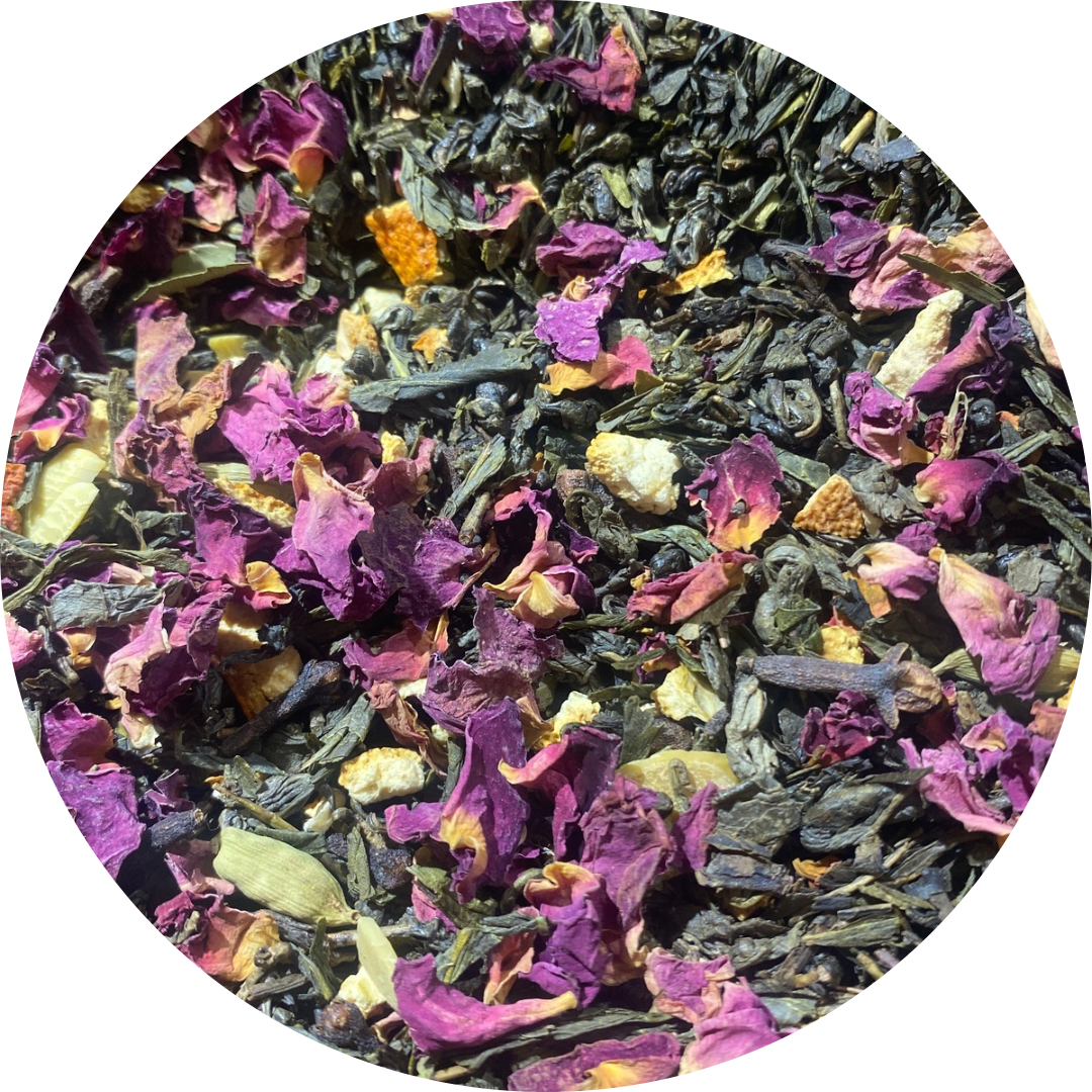 Te verde, almendras, clavo, pétalos de rosa, vainilla, cardamomo y naranja