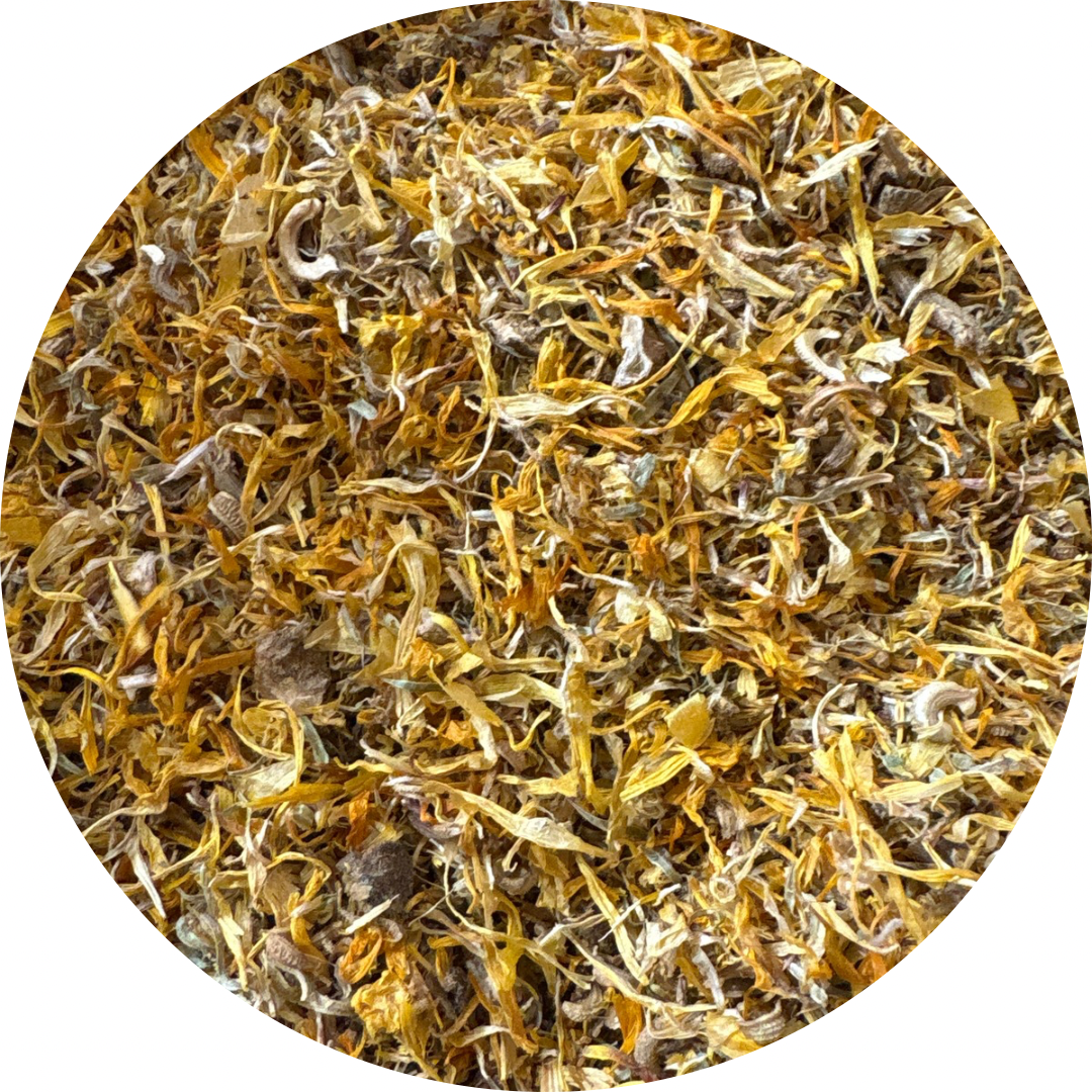 La caléndula (Calendula officinalis) posee propiedades antiinflamatorias, emolientes y digestivas. Su infusión se emplea para calmar mucosas irritadas, apoyar la función digestiva y aportar bienestar general.