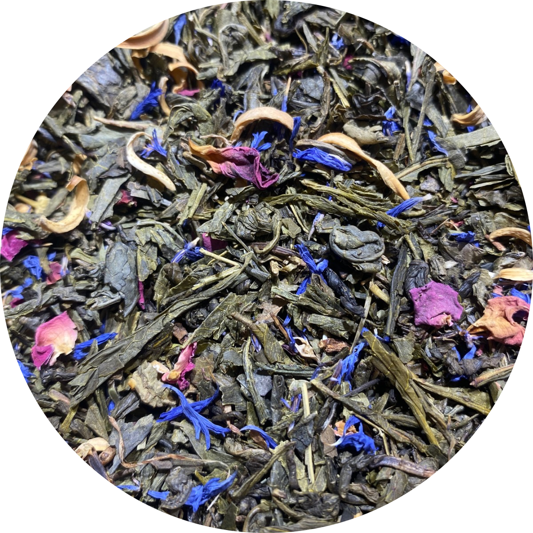 Té verde sencha, melocotón, rosas, flor de aciano y azahar.